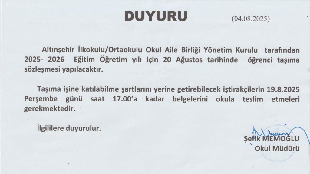 ALTINŞEHİR İLK/ORTAOKULU SERVİS ÇALIŞTIRMA İŞİ İLANI